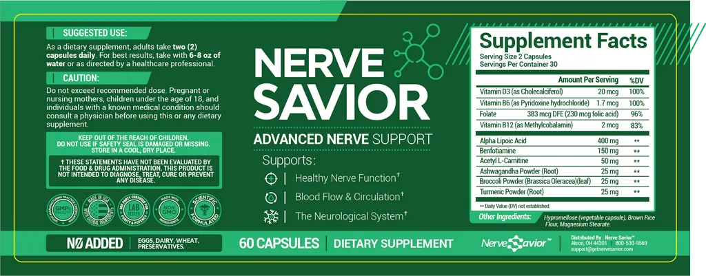 Relieve nerve pain and regain daily comfort with Nerve Savior, a premium nerve support supplement formulated to target the root causes of discomfort in the hands, feet, and limbs. This all-in-one formula is designed to:
