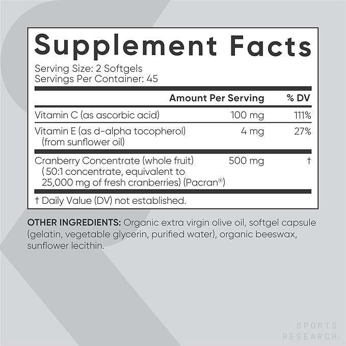 - PURE & POWERFUL: The Sports Research formula delivers 500 mg of Pacran cranberry concentrate—equivalent to 25,000 mg of fresh cranberries—in just one serving, harnessing the power of pure cranberry juice in a 50:1 ratio
